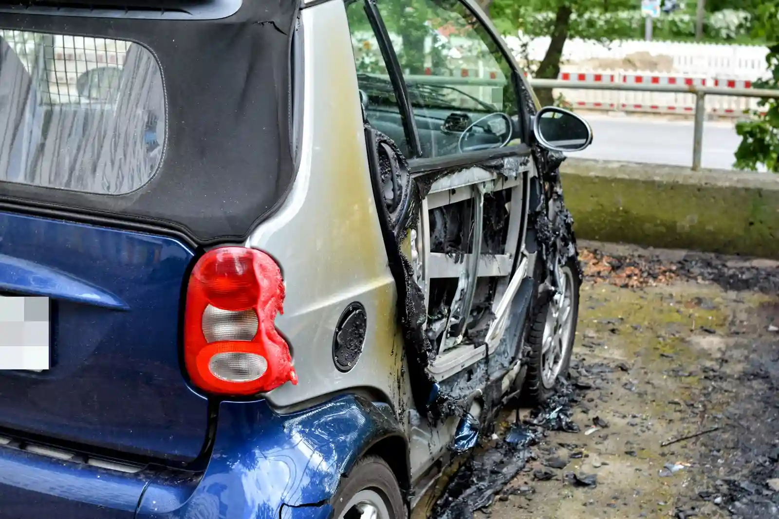 Besonders betroffen ist ein in unmittelbarer Nähe abgestellter Smart. An dem Fahrzeug entstand erheblicher Sachschaden, die Beifahrertür schmolz infolge der Hitzeeinwirkung.