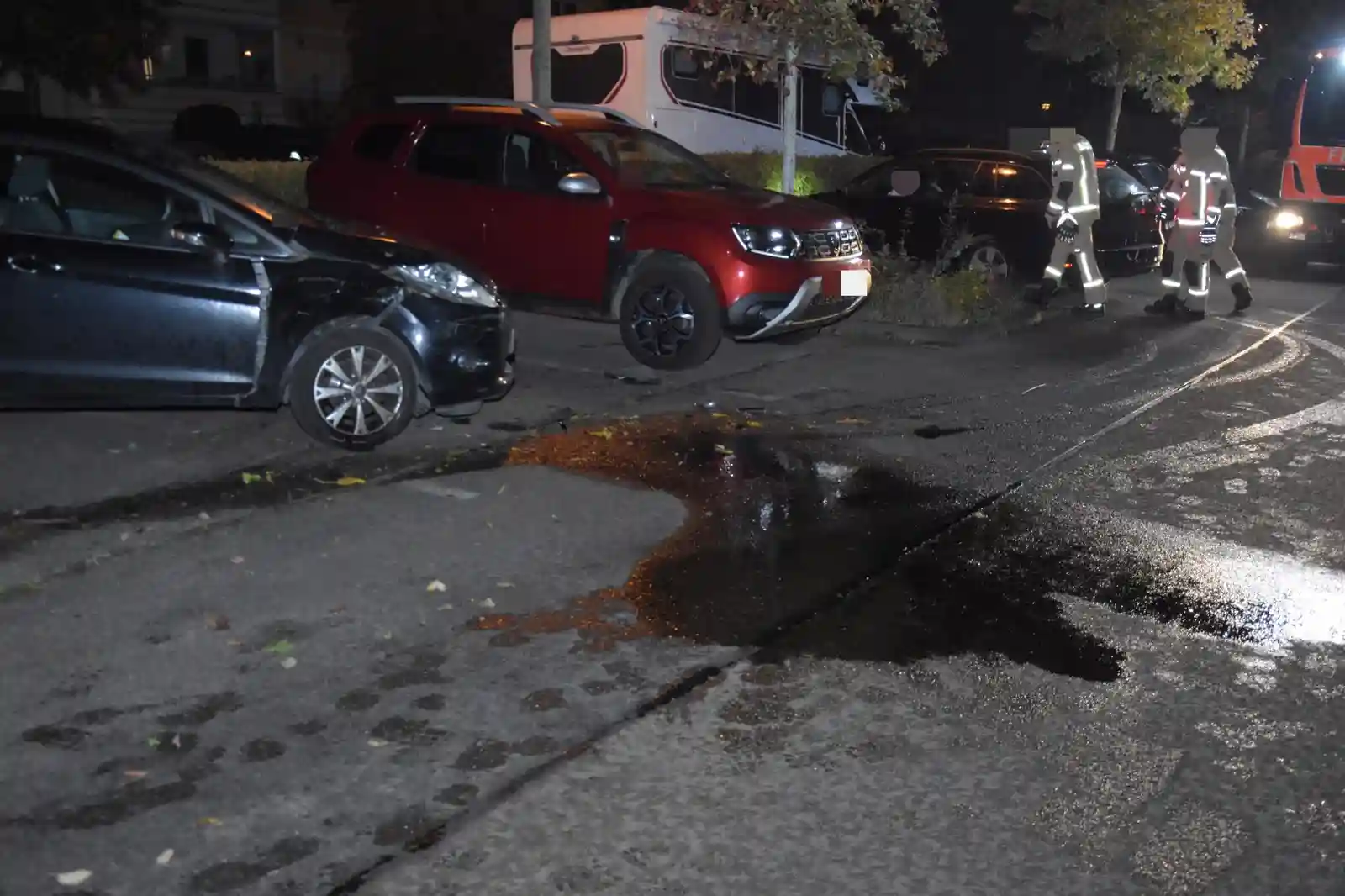 Die Feuerwehr sicherte die Unfallstelle, räumte beschädigte Fahrzeugteile von der Fahrbahn, band ausgelaufene Betriebsmittel ab und übernahm das Batteriemanagement an den beteiligten Fahrzeugen. Verletzt wurde nach bisherigen Erkenntnissen niemand.