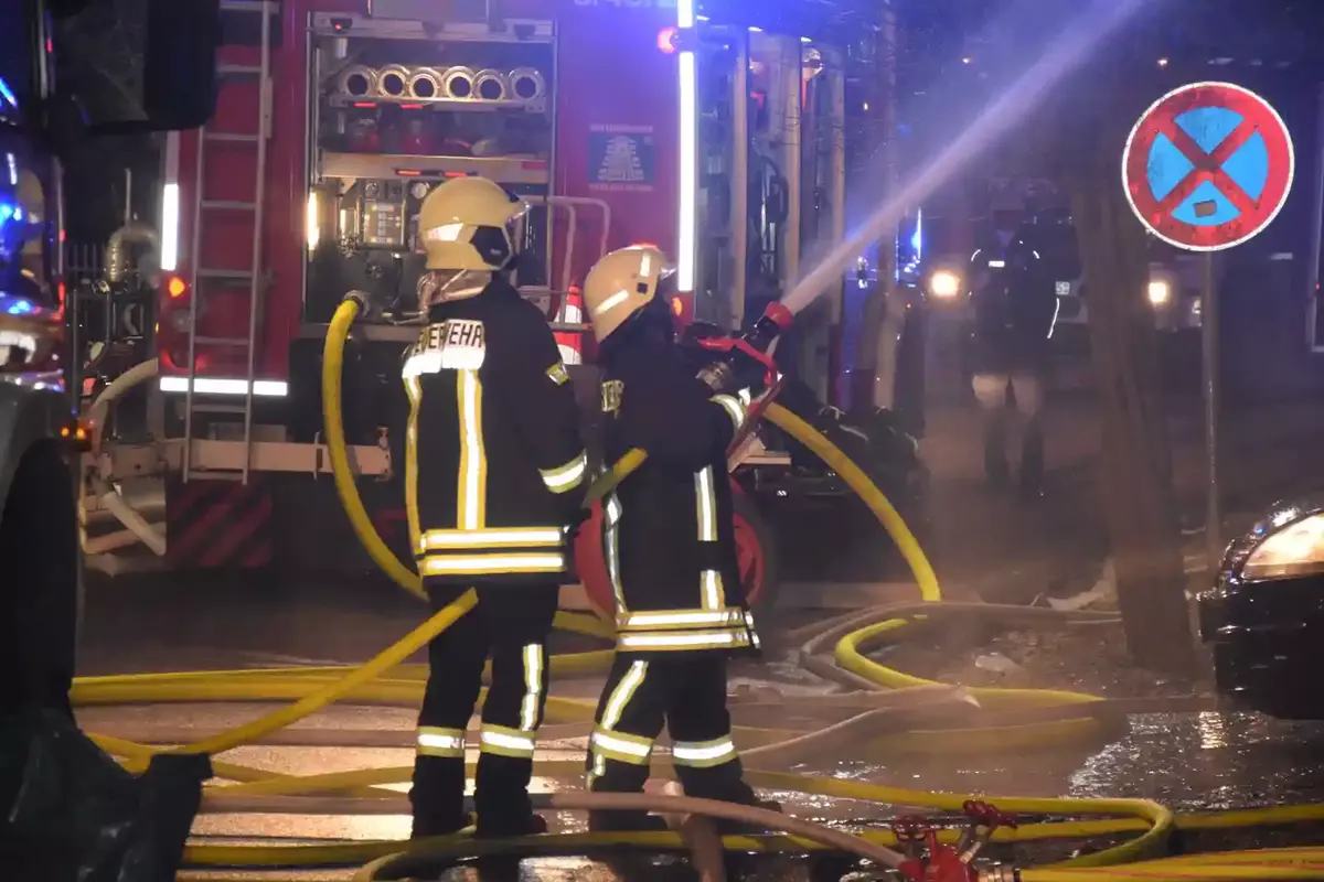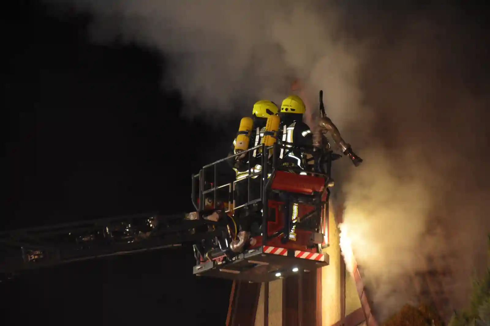 Mit mehreren C-Rohren begannen die Feuerwehrleute umgehend den Löschangriff. Vorrangiges Ziel war es, das angrenzende zweigeschossige Einfamilienhaus zu schützen. Dennoch hatte sich das Feuer zu diesem Zeitpunkt bereits unter die Dachziegel des Wohnhauses ausgebreitet. Um die Flammen gezielt bekämpfen zu können, mussten Teile der Dacheindeckung geöffnet werden.