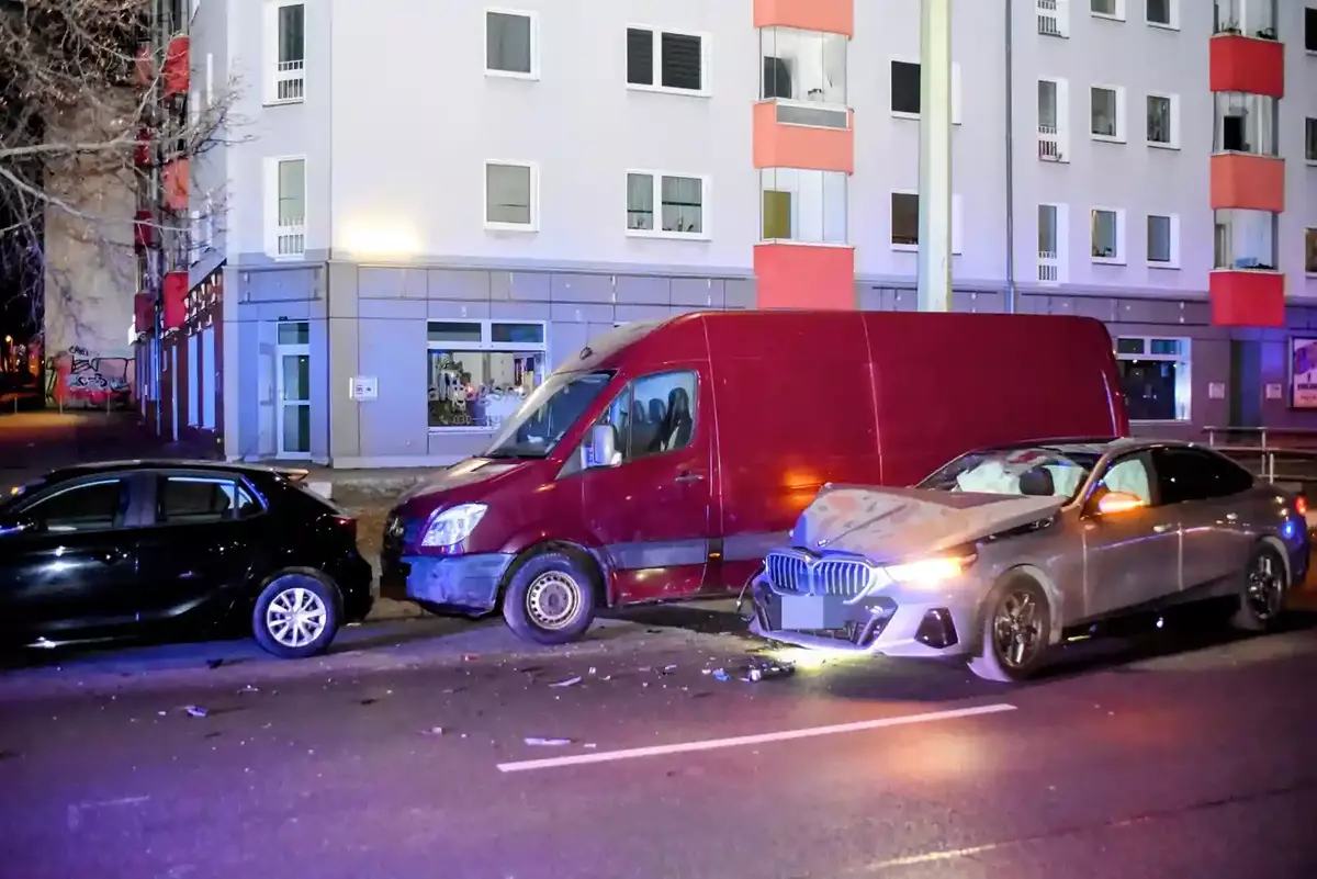 Nach einer Kollision in den frühen Morgenstunden auf der Frankfurter Allee in Berlin-Lichtenberg ermittelt die Polizei wegen Fahrerflucht. Gegen 4 Uhr kollidierte ein silbergrauer BMW 520i zunächst mit einem VW-Transporter und prallte anschließend auf das Heck eines Mercedes-Transporters. Drei Fahrzeuge wurden dabei beschädigt.