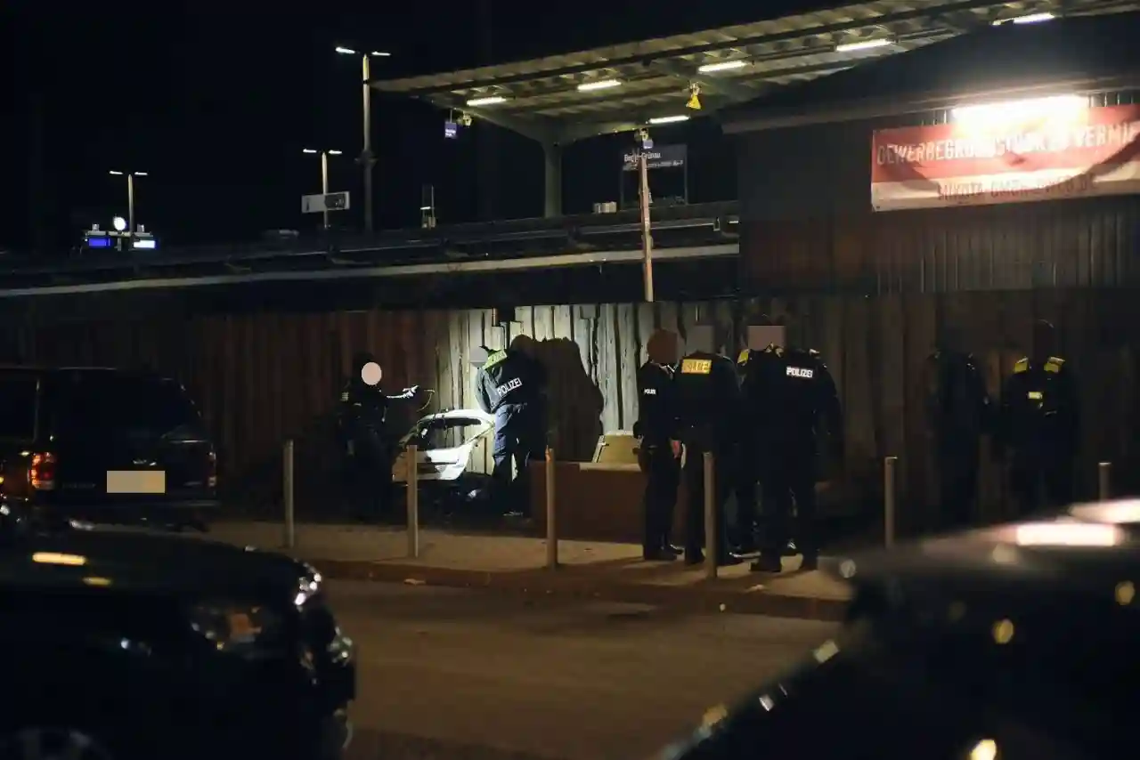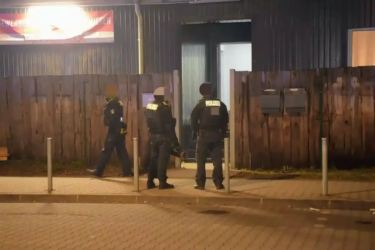 Zeugenhinweise führten die Einsatzkräfte zu einem Büro- und Lagergebäude unweit des Tatorts. Dort sollten sich mehrere Tatverdächtige versteckt halten. Auf Anordnung der Staatsanwaltschaft durchsuchten schwer bewaffnete Beamte der 13. Einsatzhundertschaft das Gebäude Raum für Raum. Mindestens fünf Türen wurden gewaltsam geöffnet, während die Einsatzkräfte lautstark „Polizei, Polizei!“ riefen.