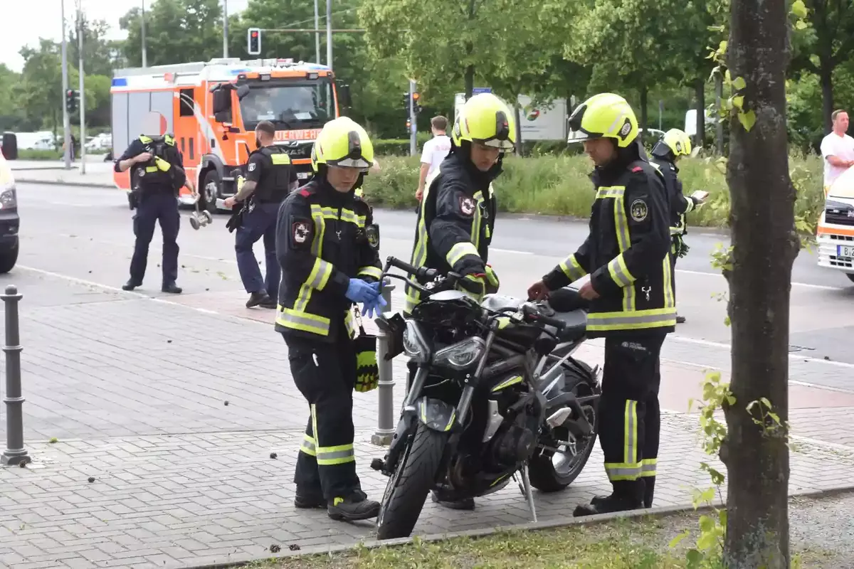 Nach Angaben der Polizei kollidierten gegen 14.40 Uhr in Höhe des West-Eingangs zu den „Gärten der Welt“ ein Motorrad und ein Pkw. Eine 37-jährige Fahrerin eines mit drei Personen besetzten Mitsubishi wollte demnach einen Wendevorgang einleiten, als es zur Kollision kam. Das Motorrad, auf dem sich ein 35-jähriger Fahrer und seine 22 Jahre alte Sozia befanden, prallte frontal in die Seite des Wagens. Beide wurden durch die Wucht des Aufpralls über die Motorhaube geschleudert und schwer verletzt auf die Fahrbahn geschleudert.