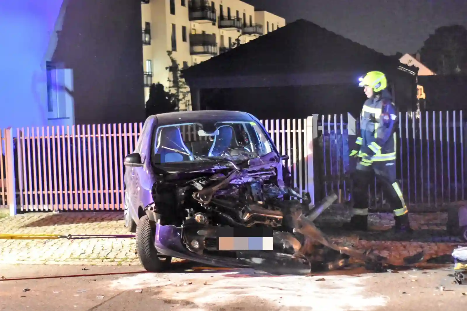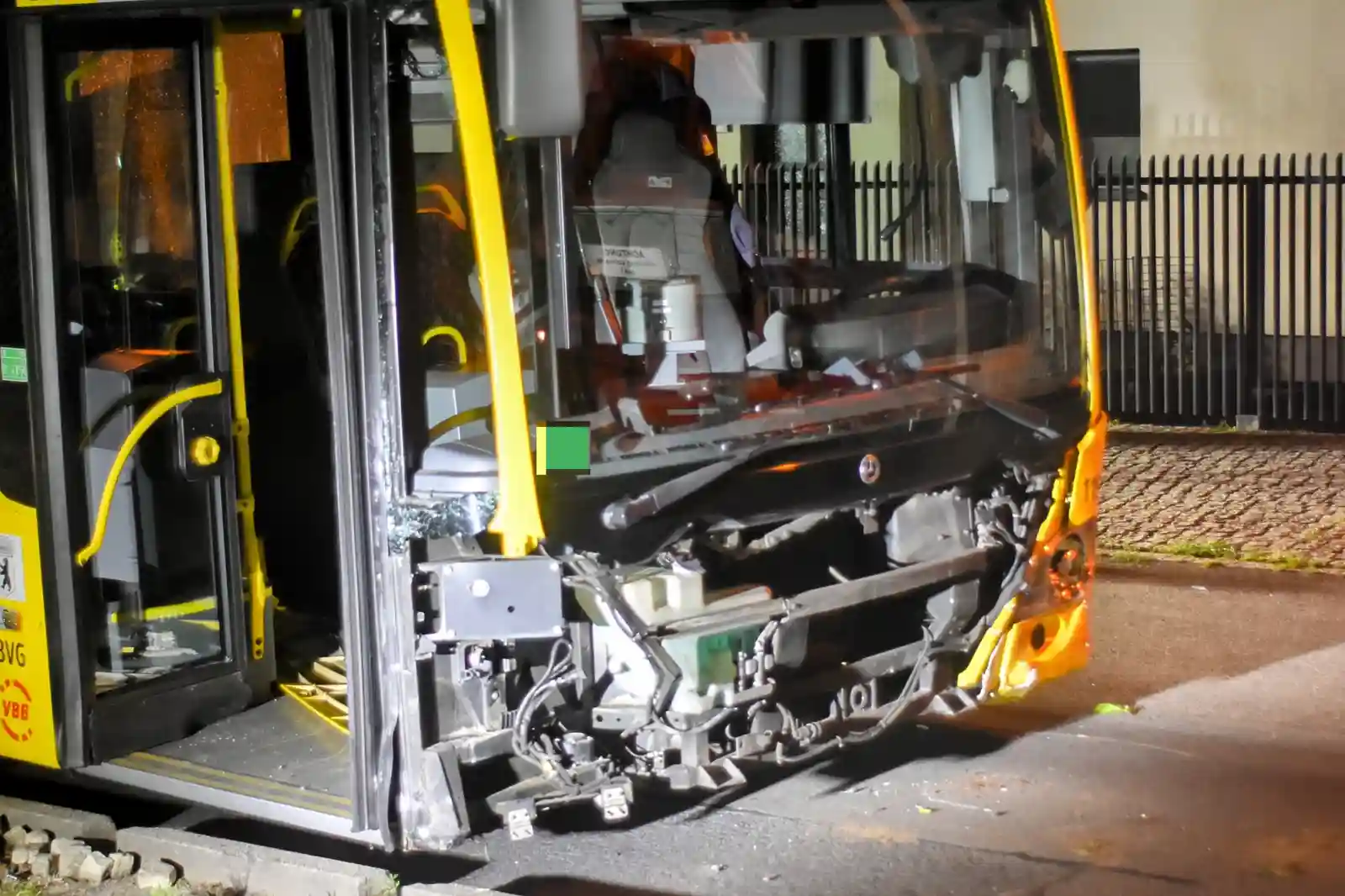 Ein Pkw wurde frontal erfasst und durch die Wucht des Aufpralls gegen einen Zaun geschoben. Die gesamte Front des Wagens wurde dabei zerstört. Der Bus kollidierte außerdem mit einem Stromkasten, bevor er schließlich im Vorgarten eines Einfamilienhauses zum Stehen kam.